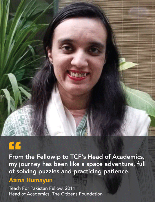 Her journey in bringing about transformative change in people’s lives has been nothing less than intergalactic. She has gone from teaching a classroom of 50 students as a TFP Fellow in 2011 to providing education support to 40 schools, to working on academic designs for 1200 schools, and onwards to designing a nationwide education program. Curriculums and textbooks developed under her guidance are being used in schools all across Pakistan. In this, she feels, backward planning and breaking down large jigsaw puzzles into small pieces, a skill she mastered during her TFP Fellowship, has been invaluable.
