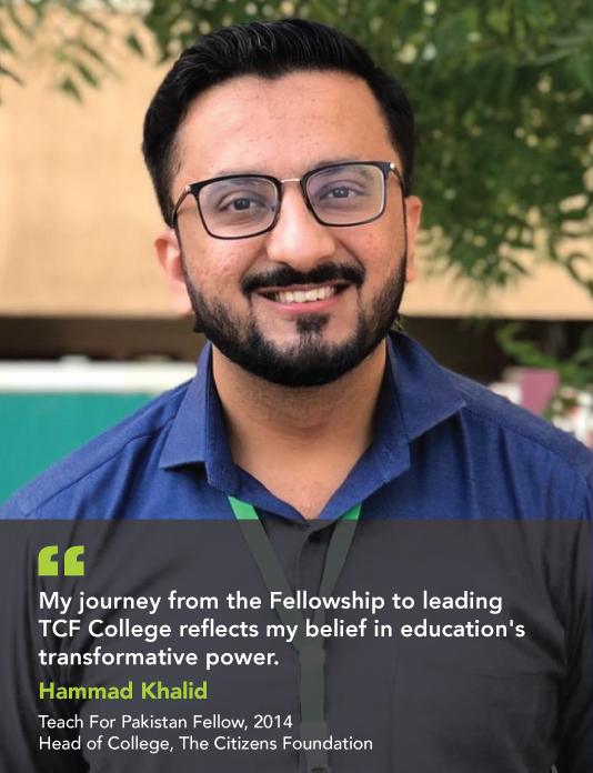 Hammad works at The Citizens Foundation as Head of TCF College. He credits his journey within the education sector as heavily influenced by his TFP experience. Clarity of purpose, the importance of patience, self-reflection, and gratitude for the opportunity to help others realize their dreams are some of the abiding traits he believes the TFP has ingrained in him.